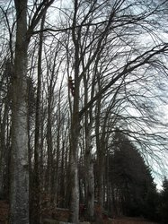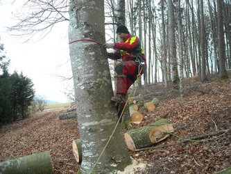 Anbringen des Windenseils um die Buchen bergwärts zu ziehen
